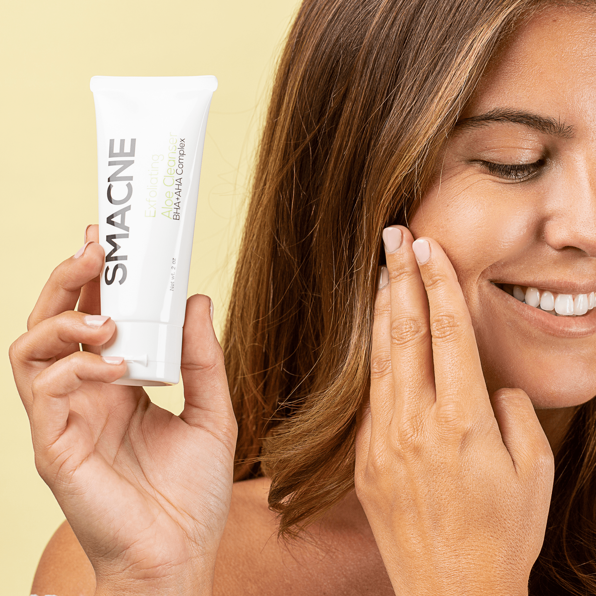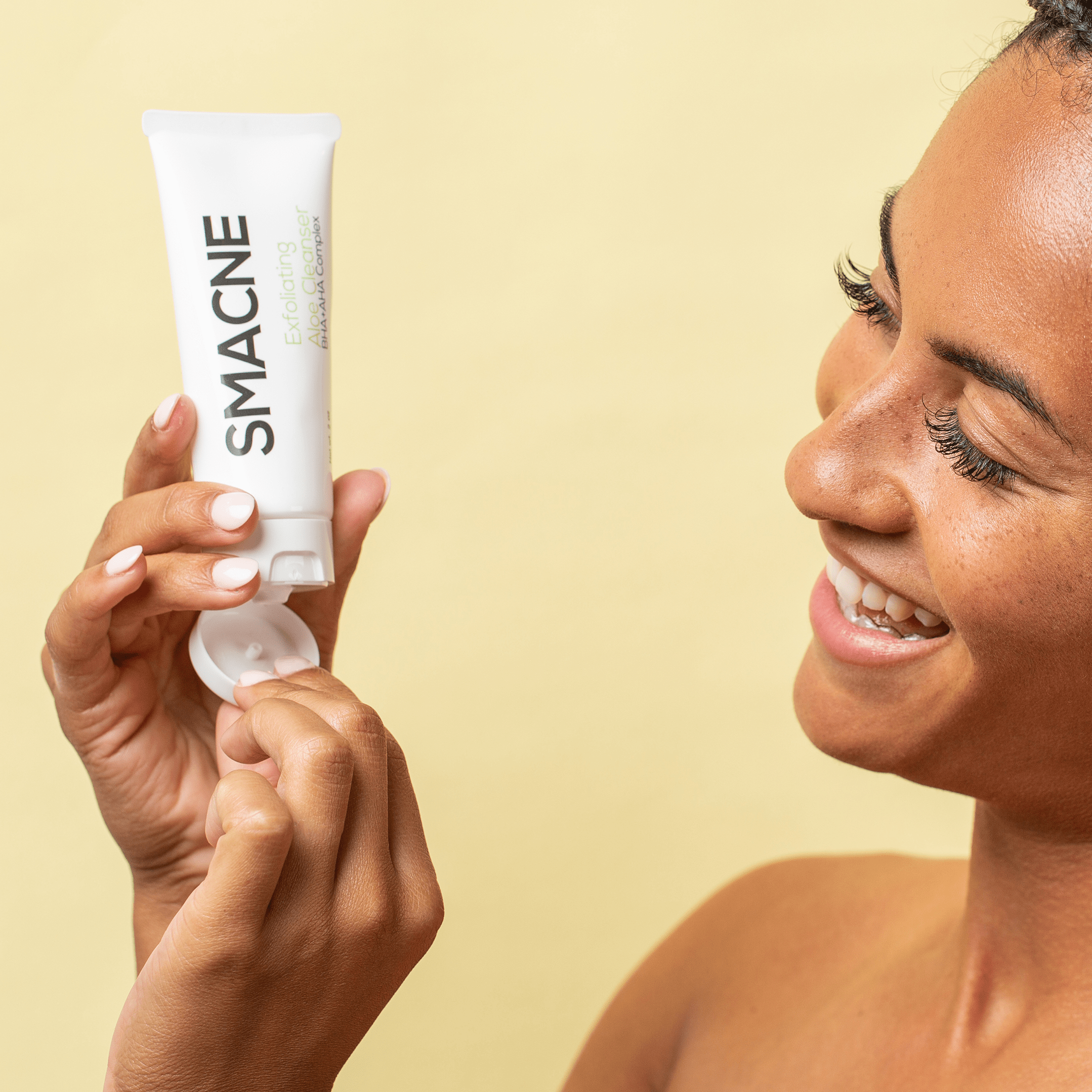 The Smacne Cleanser uses pro-quality AHAs and BHAs to unclog pores and removes acne-causing oils to prep the skin for the treatment.